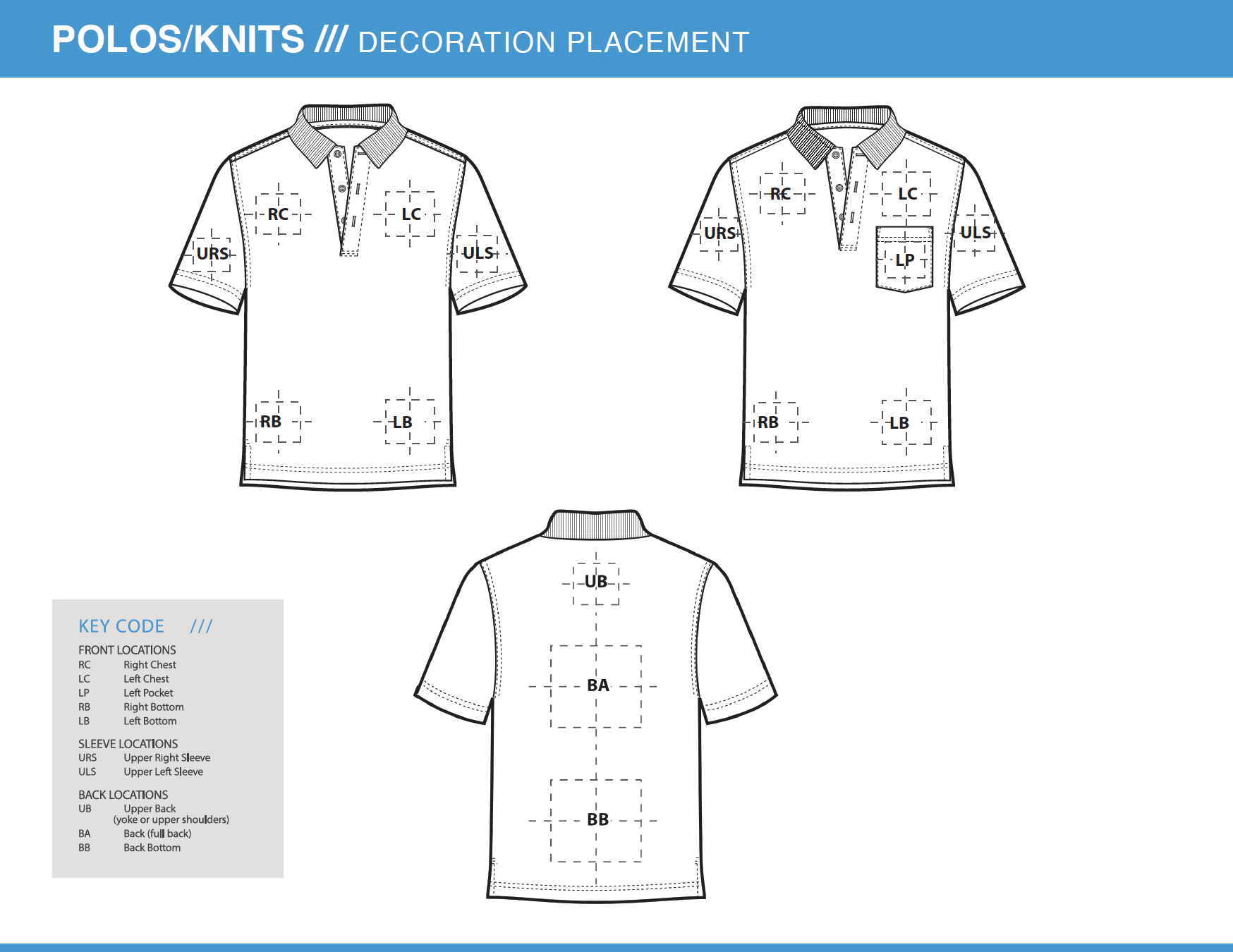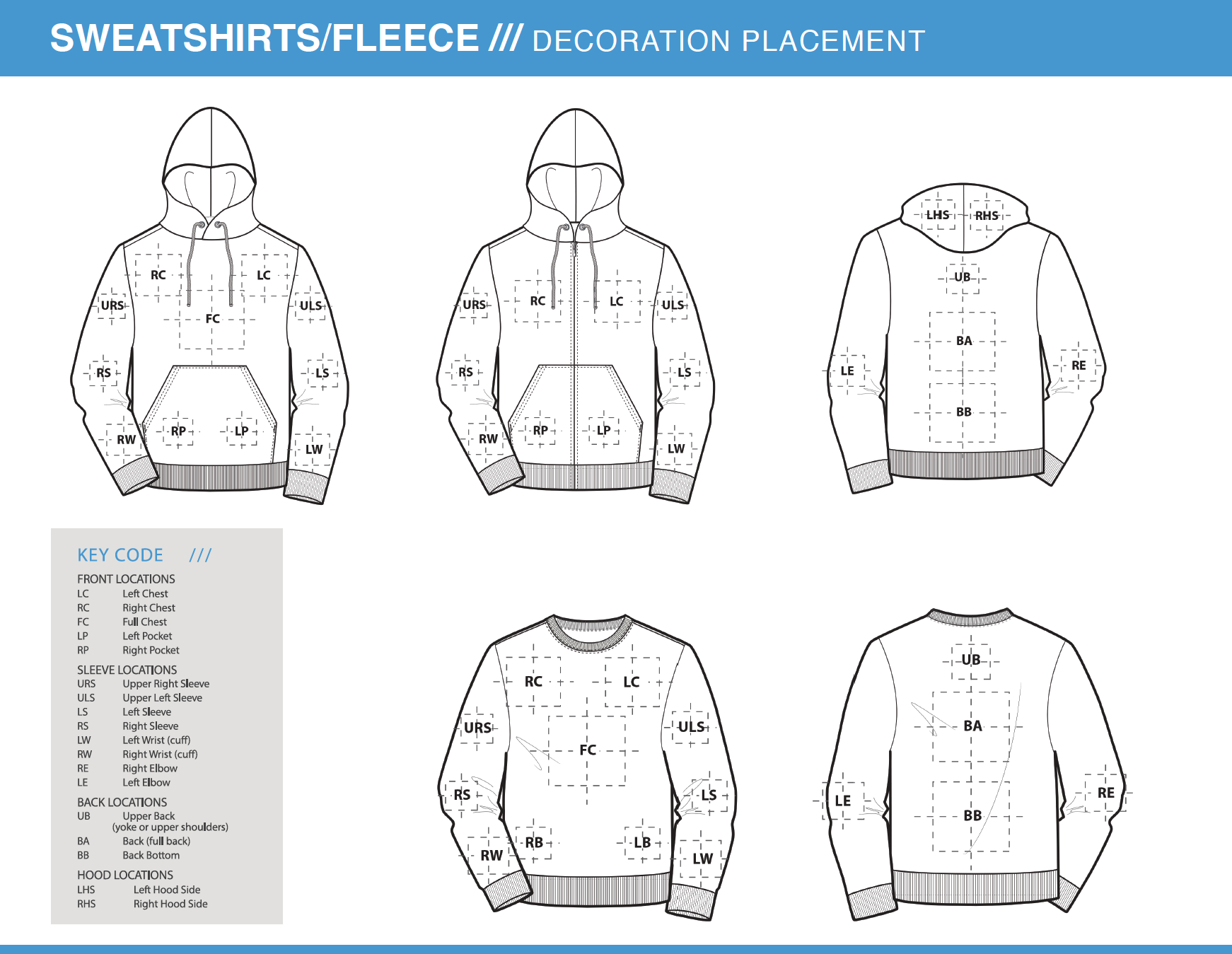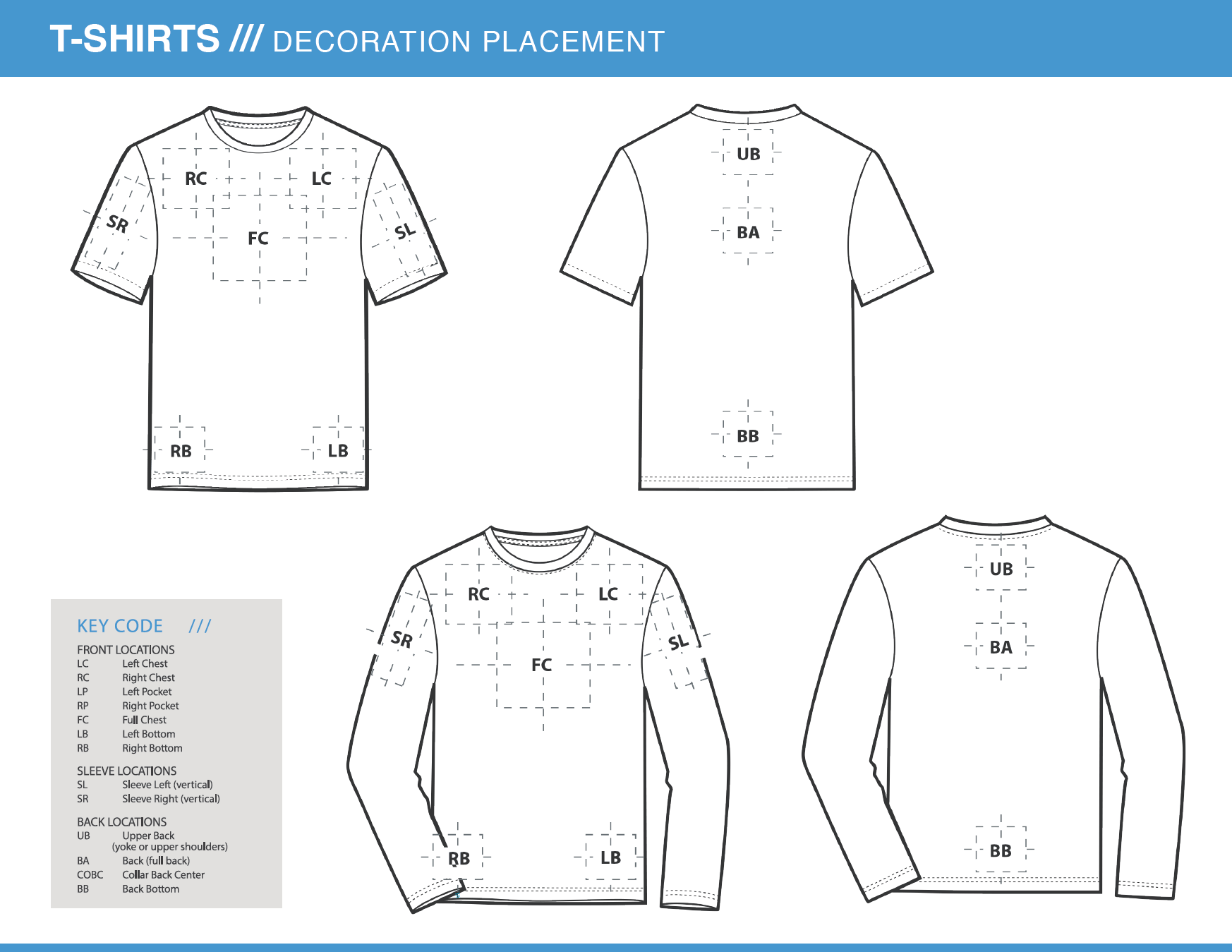 Looking for ideas on where decorations typically can go take a look at the placement guides below. If you're interested in a placement that isn't shown - no problem at all! Just let us know where you are thinking and on what item and we will see if it can work. We have a bunch or hoops and platens and such on our machine so we just need to make sure everything fits - but if we can make it happen for you we will for sure!