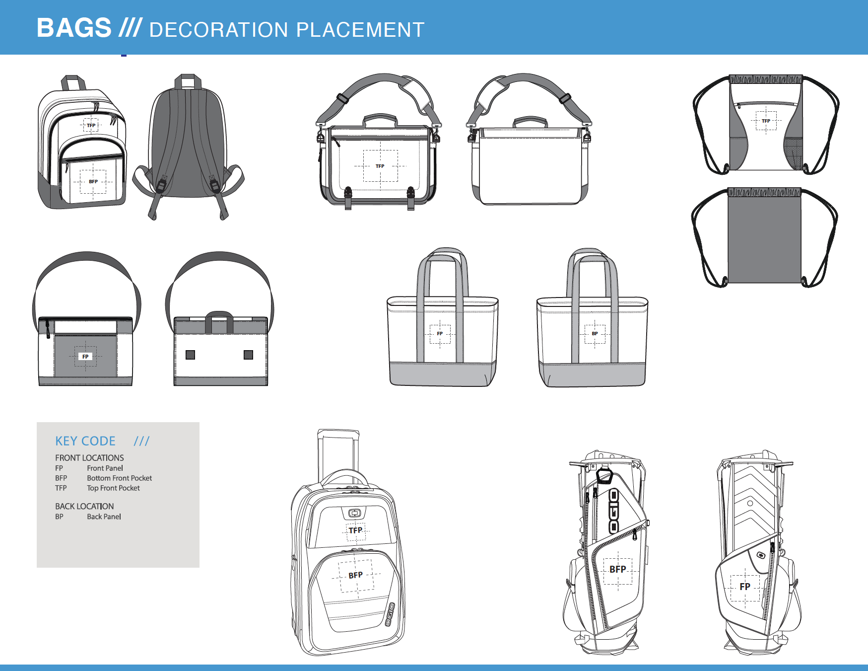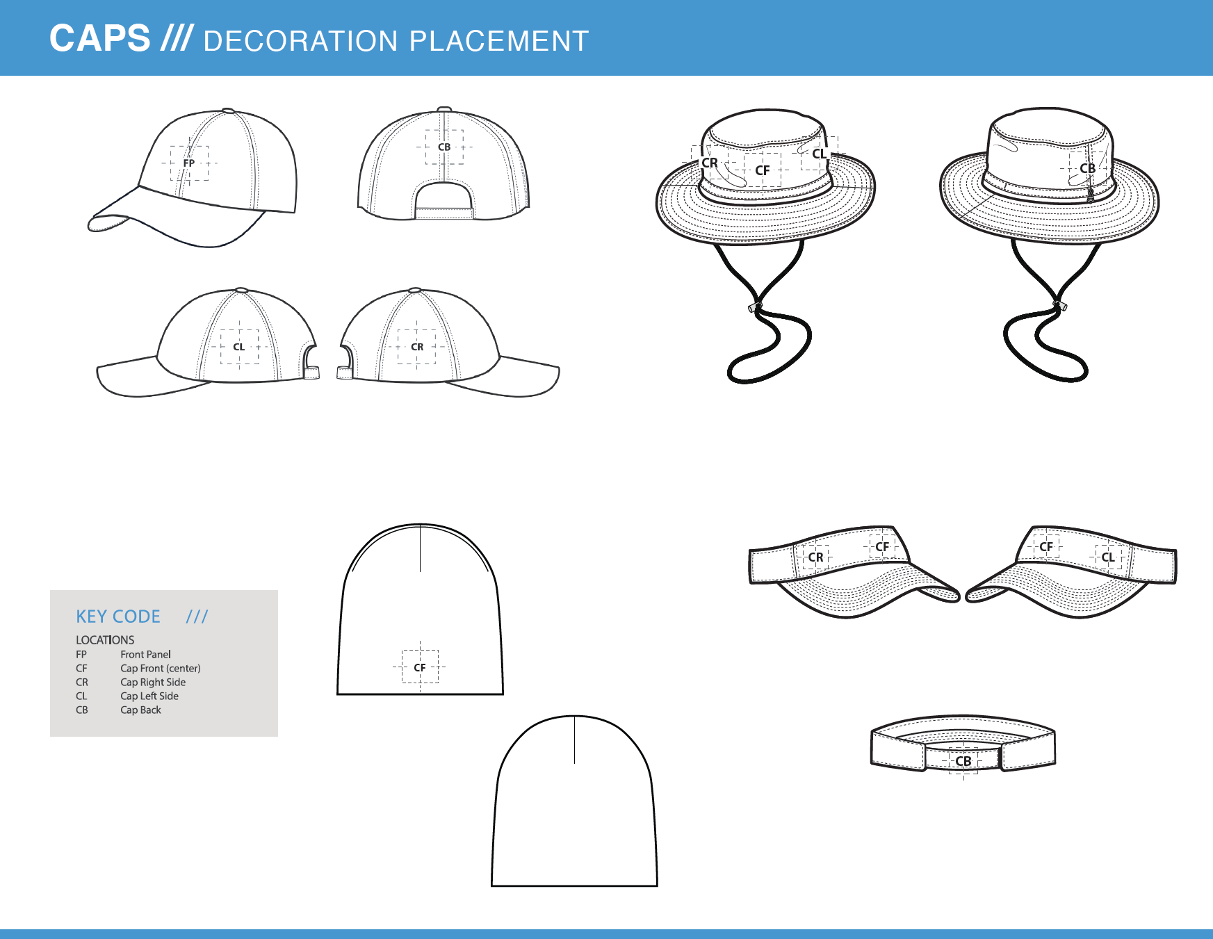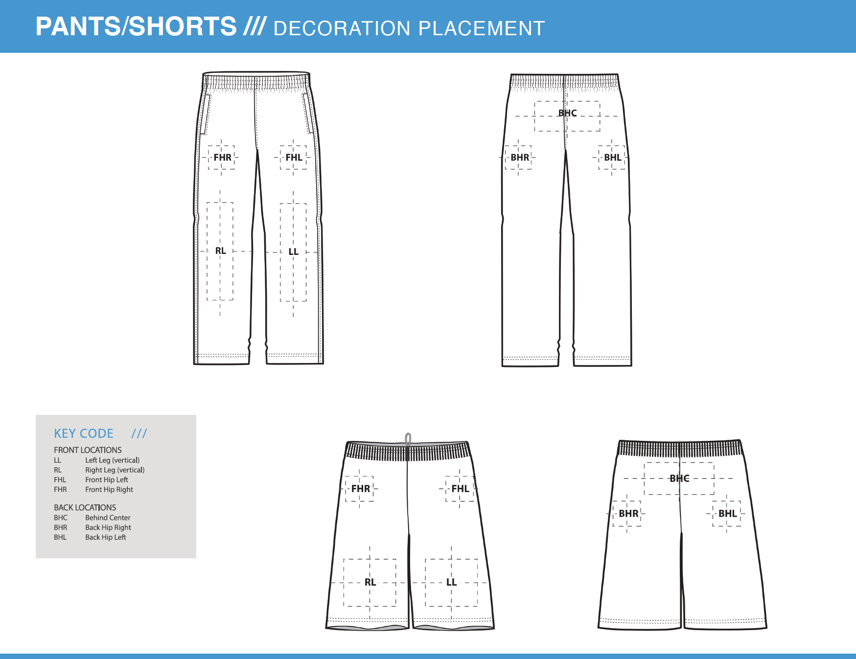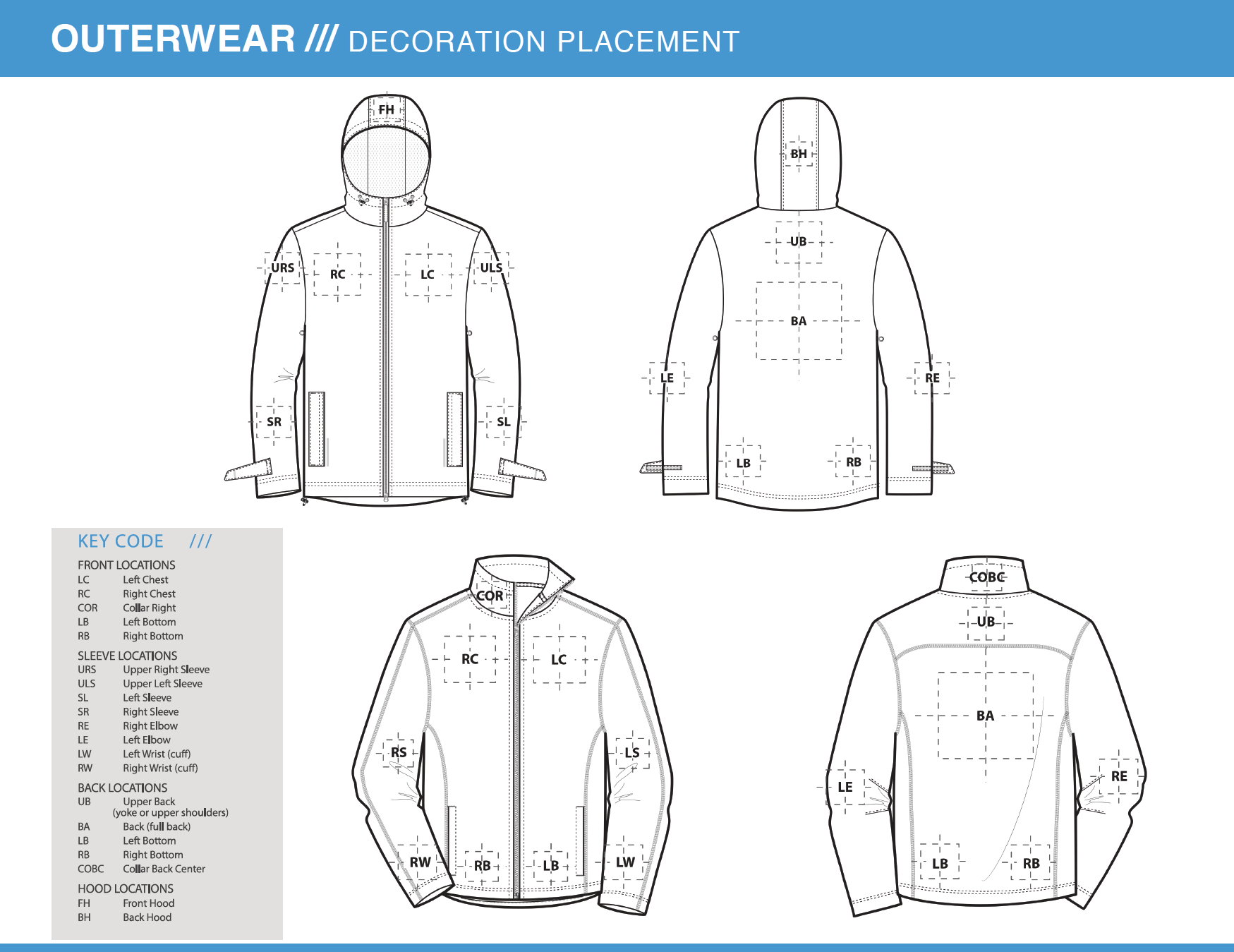 Looking for ideas on where decorations typically can go take a look at the placement guides below. If you're interested in a placement that isn't shown - no problem at all! Just let us know where you are thinking and on what item and we will see if it can work. We have a bunch or hoops and platens and such on our machine so we just need to make sure everything fits - but if we can make it happen for you we will for sure!