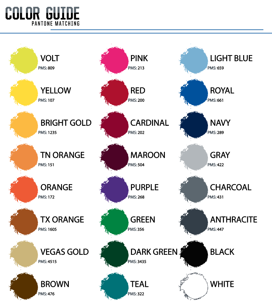 When it comes to ink colors to match your brand - the world is your oyster! Below you will find our guide to colors we always have in stock! We also have a whole bunch more behind the scenes as well but they rotate a lot so we don't show them here. Can't find the right color on our guide - no worries at all we can Pantone match any color for the perfect look! Not sure about a Pantone color but have art? We can grab a HEX code from your art and match it as close as possible with our Pantone ink matching system!
